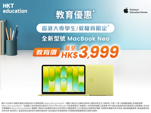 教育優惠專為香港大專、中、小學及幼稚園學生及教職員而設。涵蓋超過35個品牌、逾千件產品,優惠低至5折!當中包括各款5G手機、 AI 智能產品及Apple產品,大專生及教職員更可享 Mac / iPad 產品優惠。一年365日隨時選購,輕鬆滿足學習及工作需求。立即按此了解更多及登記。